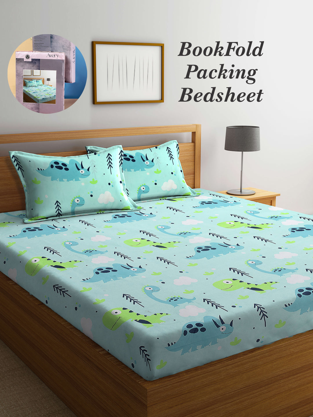 Arrabi Green Cartoon TC Cotton Blend King Size Bookfold Bedsheet with 2 Pillow Covers (250 X 215 cm)