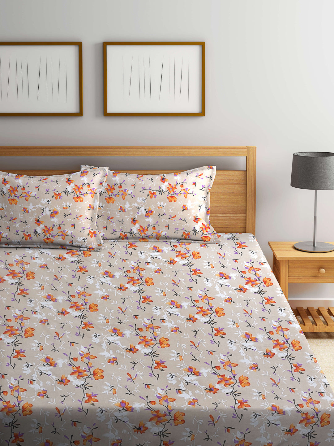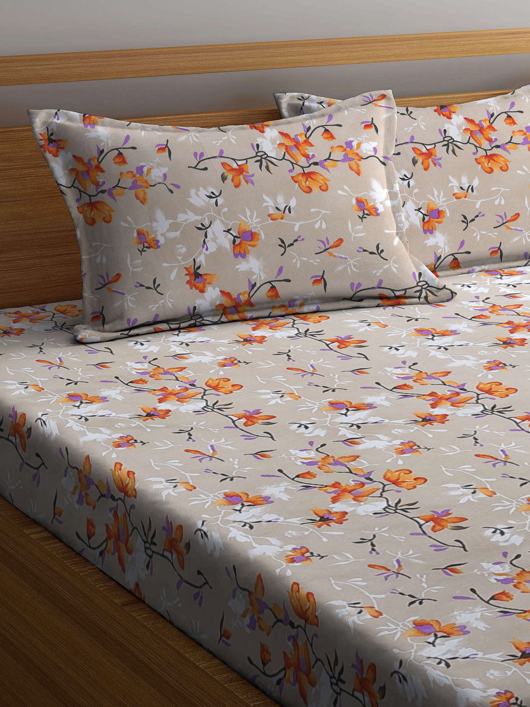 Arrabi Beige Floral TC Cotton Blend King Size Fitted Bedsheet with 2 Pillow Covers (250 x 220 cm)