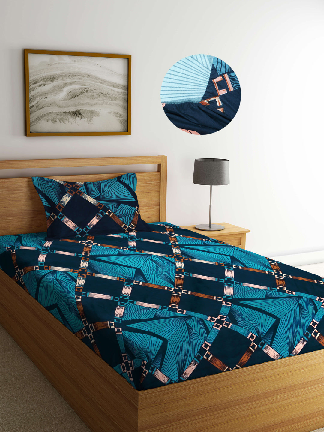 Arrabi Blue Graphic TC Cotton Blend Single Size Fitted Bedsheet with 1 Pillow Cover (220 X 150 cm)