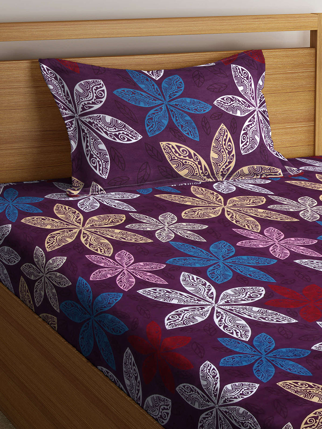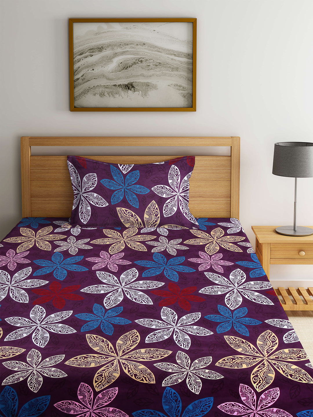 Arrabi Purple Floral TC Cotton Blend Single Size Fitted Bedsheet with 1 Pillow Cover (220 X 150 cm)