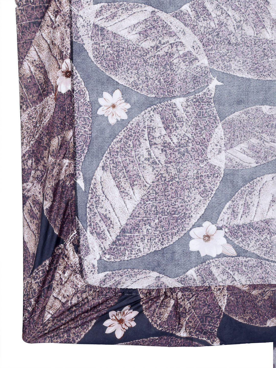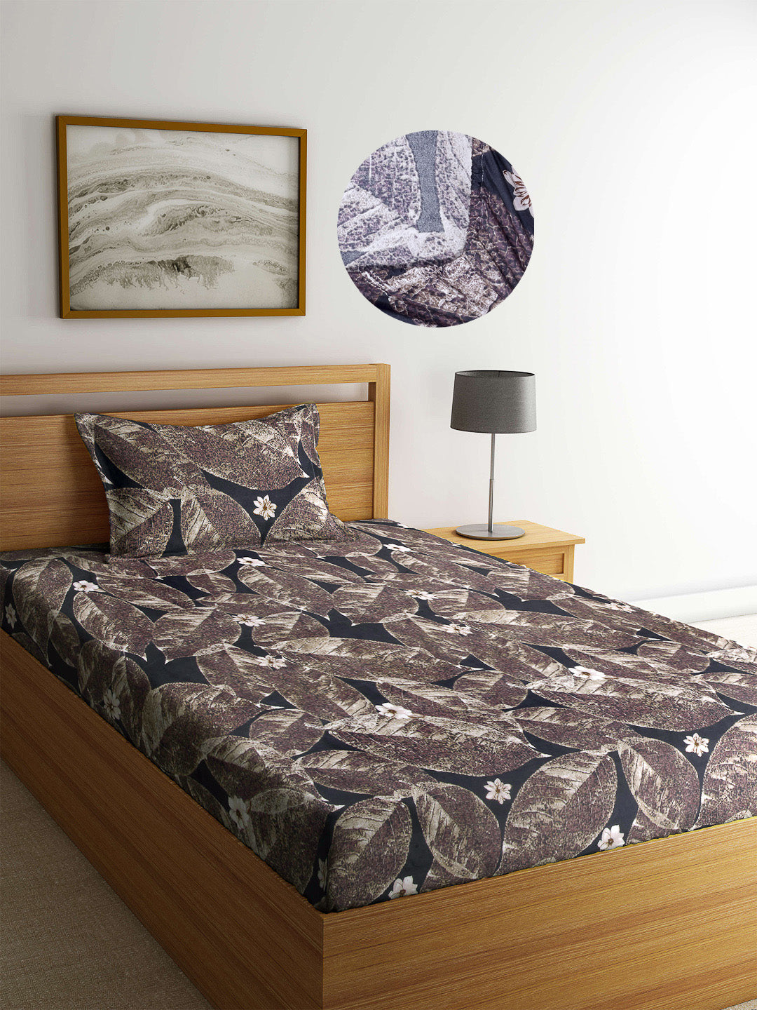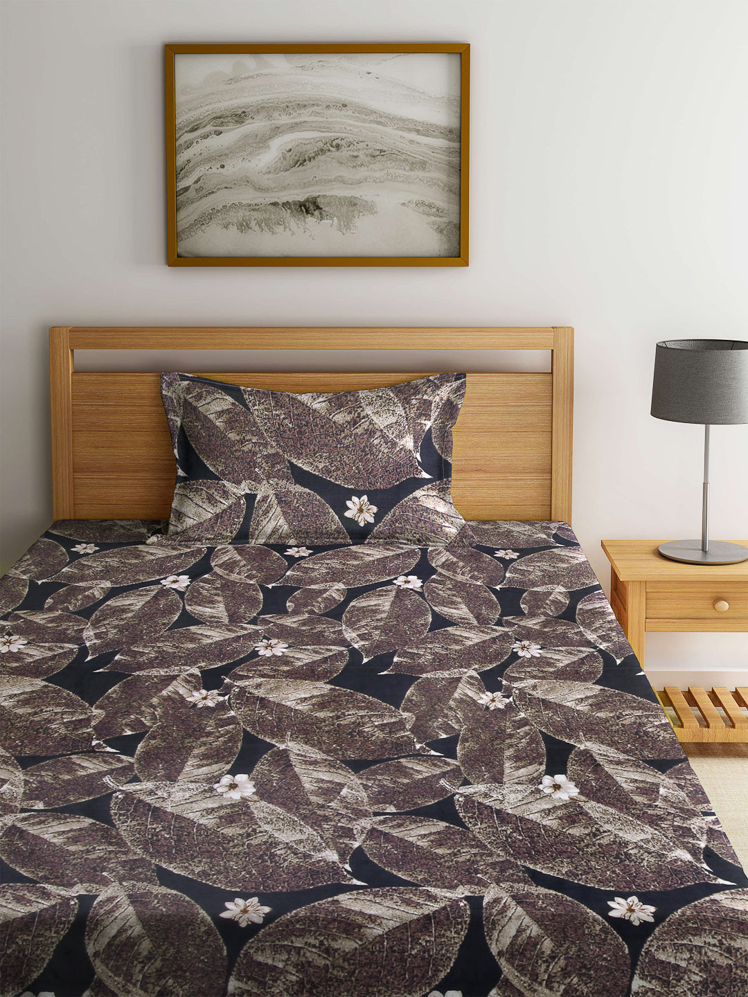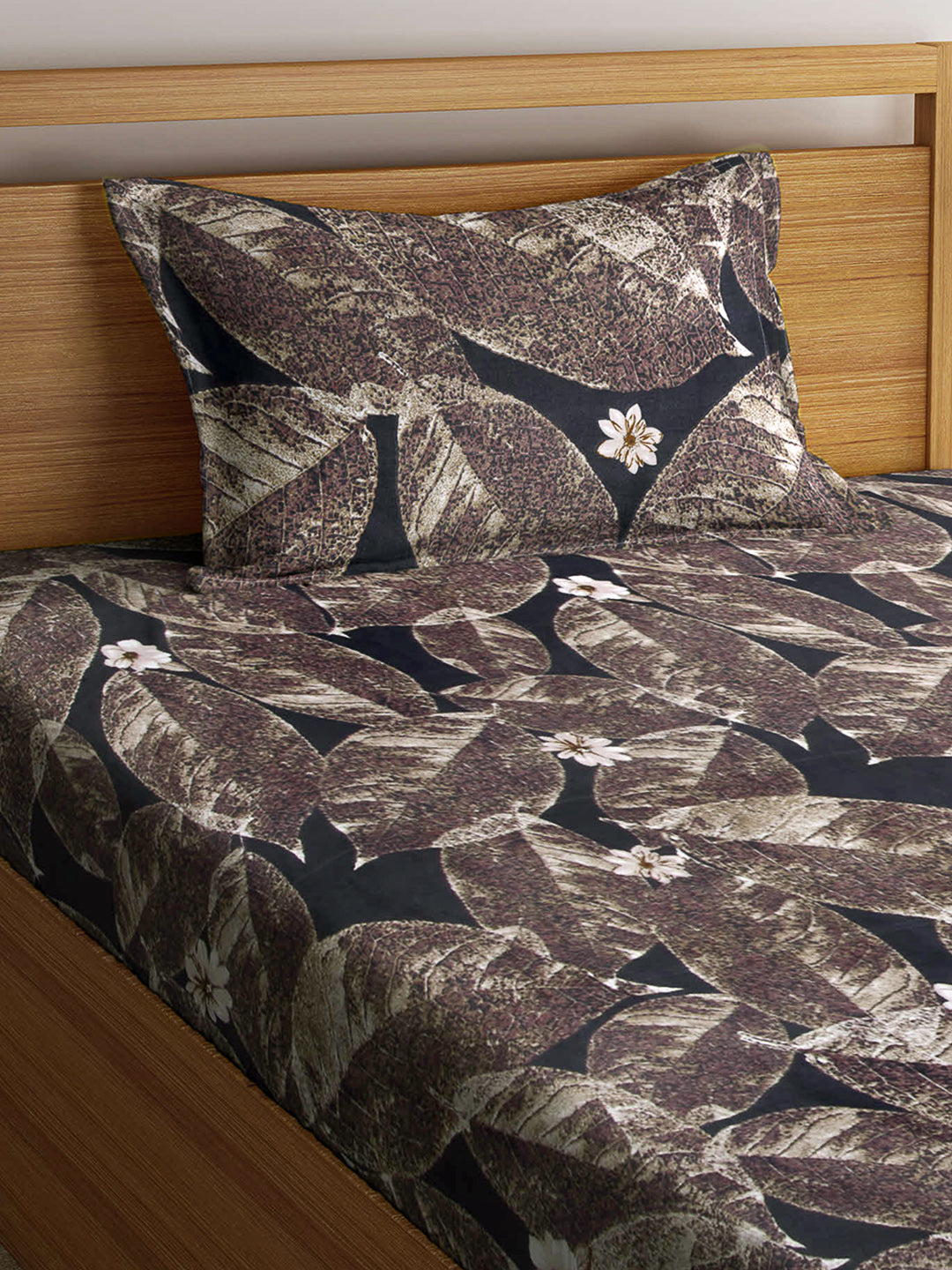 Arrabi Brown Leaf TC Cotton Blend Single Size Fitted Bedsheet with 1 Pillow Cover (220 X 150 cm)