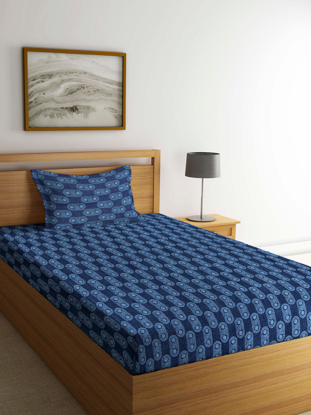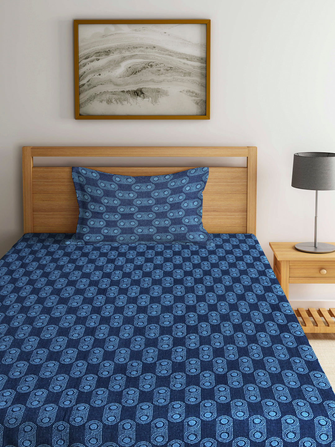Arrabi Blue Graphic Handwoven Cotton Single Size Bedsheet with 1 Pillow Cover ( 225 X 150 cm)