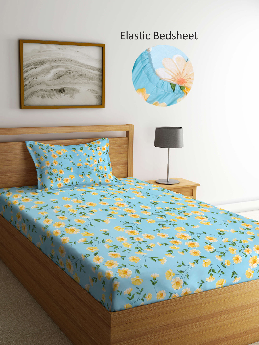 Arrabi Teal Floral TC Cotton Blend Single Size Fitted Bedsheet with 1 Pillow Cover (215 X 150 cm)